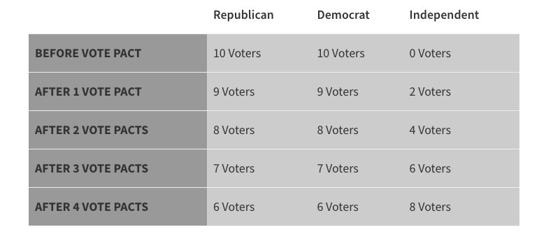 This is not “vote swapping”—in which voters in so-called “swing” states who want to vote for third parties vote for establishment candidates because they’ve “swapped” votes with committed Democrats and Republicans who vote Green or Libertarian in so-called “safe” states. This was advocated by VotePair.org and VoteTrader.org, which got lots of media coverage, both now defunct. Unlike “swapping,” VotePact is not an attempt to “minimize the damage” of a third party run—it is designed to actually shake up the political spectrum, create a realignment and open the door to actual victory for independents or emerging parties. Also, VotePact does not result in people voting for candidates they don’t want—it frees people to vote for candidates they do want, but are held back by fear because of the limitations of the voting system. While the Electoral College is central to “vote swapping,” it is not at all central to VotePact, though VotePact does work best if the two voters are in the same state.