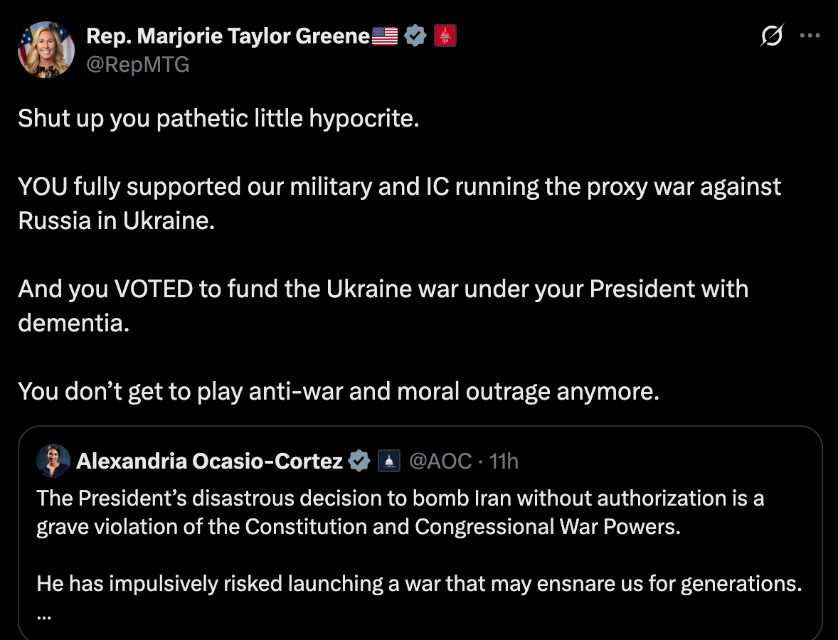 So, even now, they want to devolve into partisan bs. AOC should say she’s sorry about past backing of wars. MTG should say Trump acted in an unconstitutional manner.